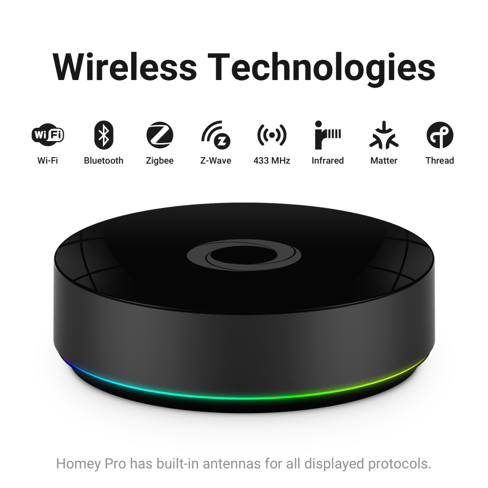 Homey Pro ist die leistungsstarke Smart-Home-Zentrale für alle, die maximale Kontrolle wollen. Er unterstützt nahezu alle gängigen Funkstandards wie Zigbee, Z-Wave, Bluetooth, Matter, Thread und Infrarot in einem einzigen Gerät. Automationen laufen lokal, schnell und ohne Cloud-Abhängigkeit oder Abo. Ideal für große Smart-Home-Setups und anspruchsvolle Nutzer:innen.